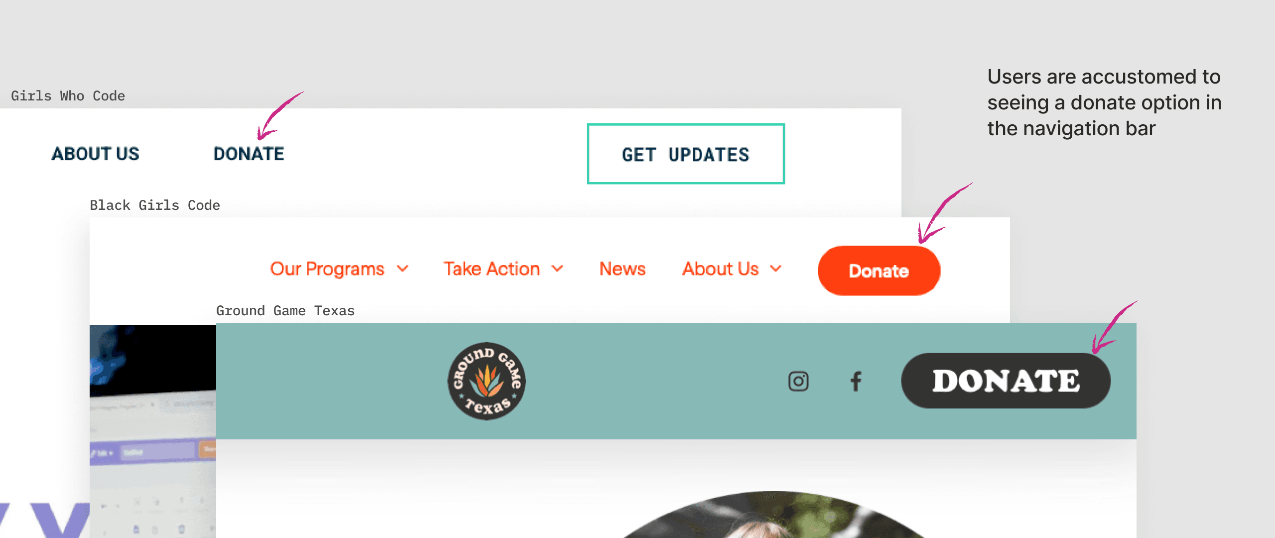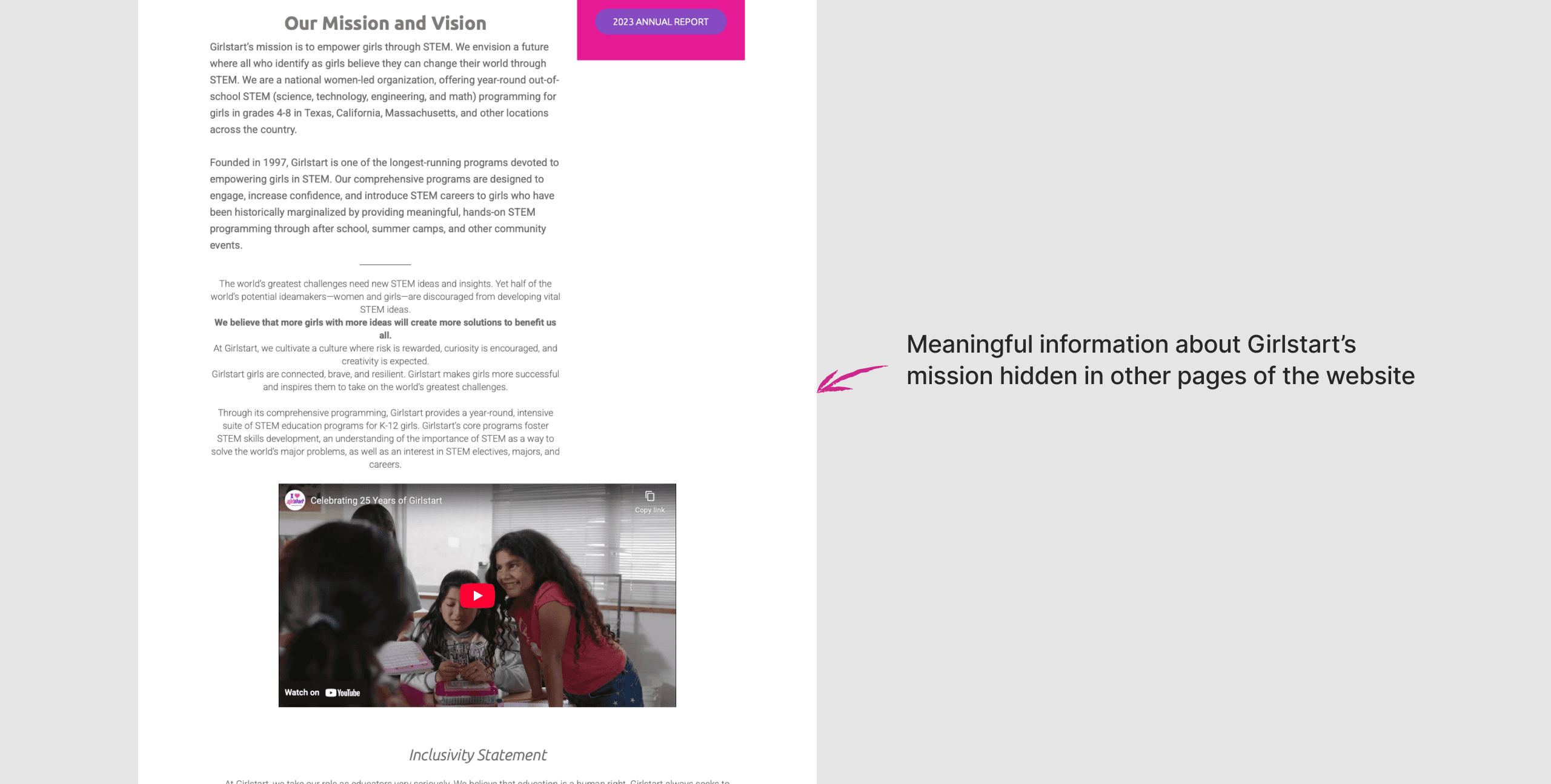 The homepage should meaningfully explain what Girlstart does before asking to “Donate.” Information about the organization was hidden in other pages, making the homepage feel disconnected.