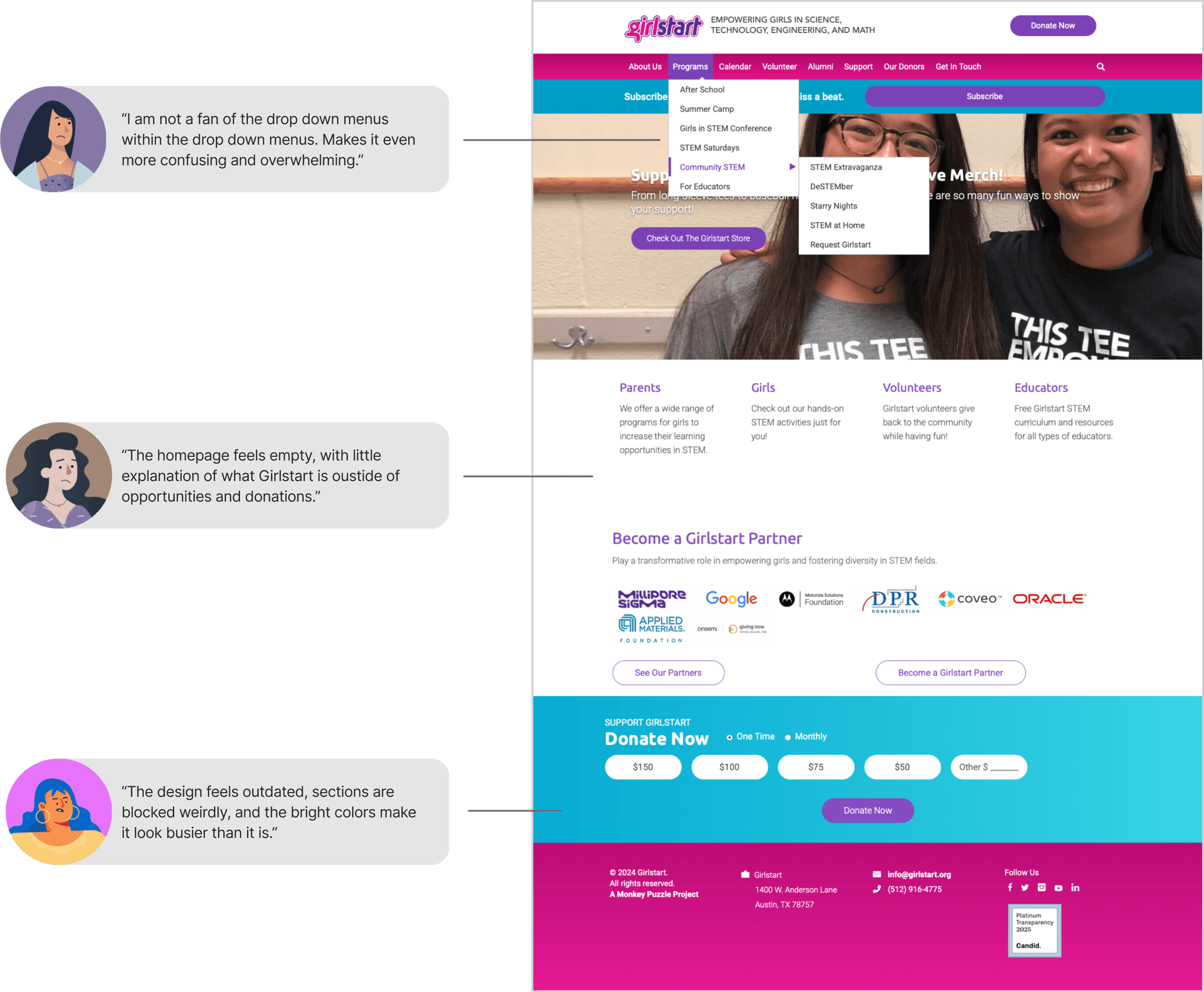 I intended to redesign Girlstart's full website but underestimated the scope. User research revealed foundational issues that needed fixing first, consuming more time than expected.