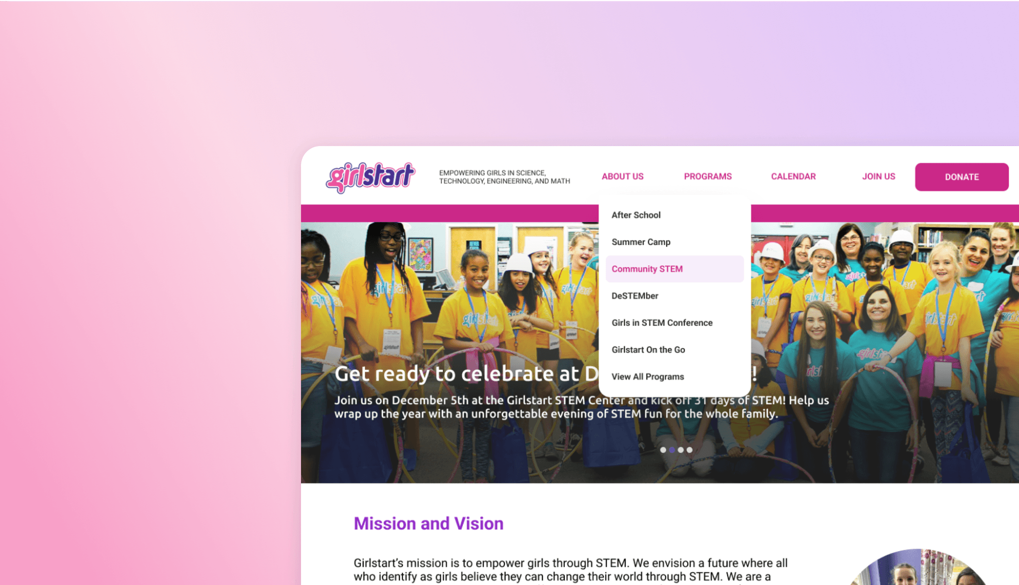 I had the opportunity to independently redesign Girlstart’s website under the guidance of my supervisors. With decades-old designs in need of purposeful updates, the challenge was to address the pain points of six main user groups with distinct needs.